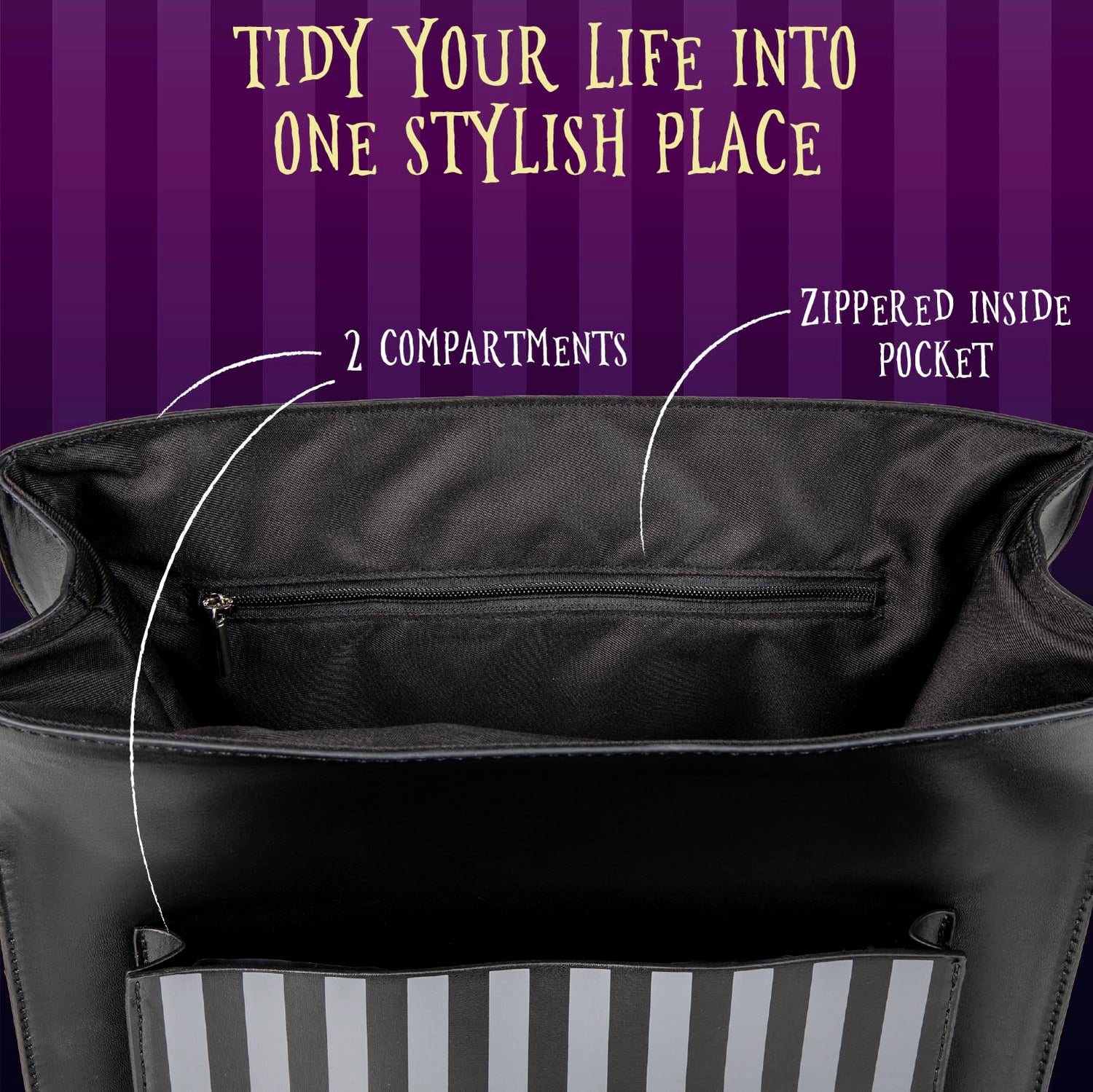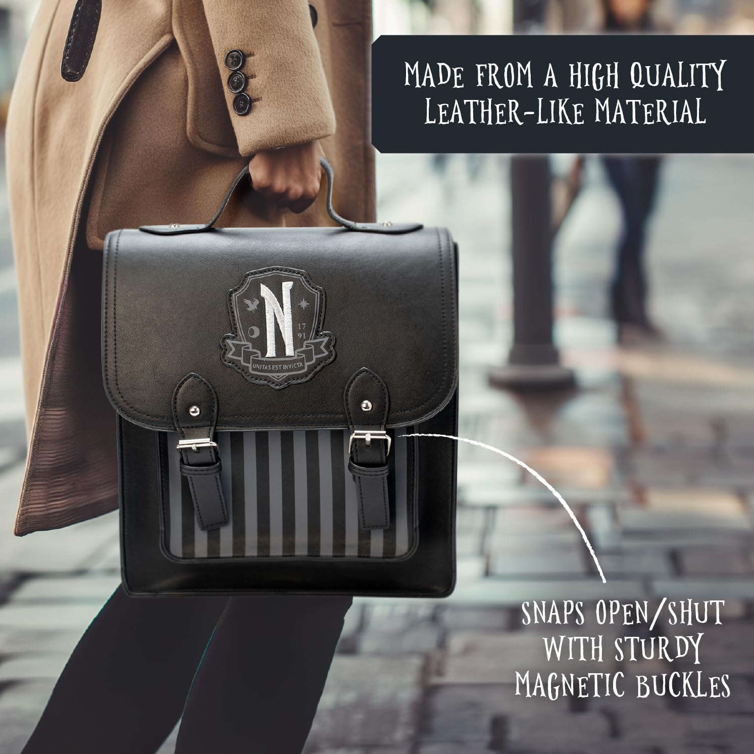 Show your love for Nevermore Academy with this stylish and practical Wednesday Satchel, a must-have for fans of the show who want a unique and functional bag for daily use. This satchel combines gothic elegance with utility, making it great for students, professionals, and anyone who admires Wednesday ’ distinctive style. Measuring 31 x 28 x 13 cm, this spacious satchel offers plenty of room for all your school or work supplies. It’s designed to easily accommodate books, notebooks, tablets, and other essentials, making it an ideal companion for students navigating classes or professionals heading to the office. The storage space ensures you can carry everything you need for a productive day. Crafted from high-quality materials, this satchel is built to last while maintaining a sophisticated appearance. The durable construction ensures it can withstand daily use, while the magnetic buckles provide a secure yet convenient way to open and close the bag. The professional look of the satchel makes it suitable for any setting, from the classroom to business meetings. This satchel includes both a sturdy handle and adjustable backpack straps, offering multiple carrying options. You can carry it by hand for a classic look or wear it as a backpack when you need to keep your hands free. This adaptability makes it easy to transition from school to work or from day to night. As officially licensed Wednesday merchandise, this satchel guarantees you’re getting a product that captures the spirit of the show. It’s a fantastic gift for any Wednesday fan, for birthdays or holidays. The satchel not only serves as a practical accessory but also as a piece of memorabilia for fans of the series. Elevate your everyday style with the Wednesday Satchel, blending practicality with a touch of Nevermore Academy’s gothic charm. Whether you’re heading to school, work, or a casual outing, this satchel is designed to meet your needs while showcasing your love for the iconic show.