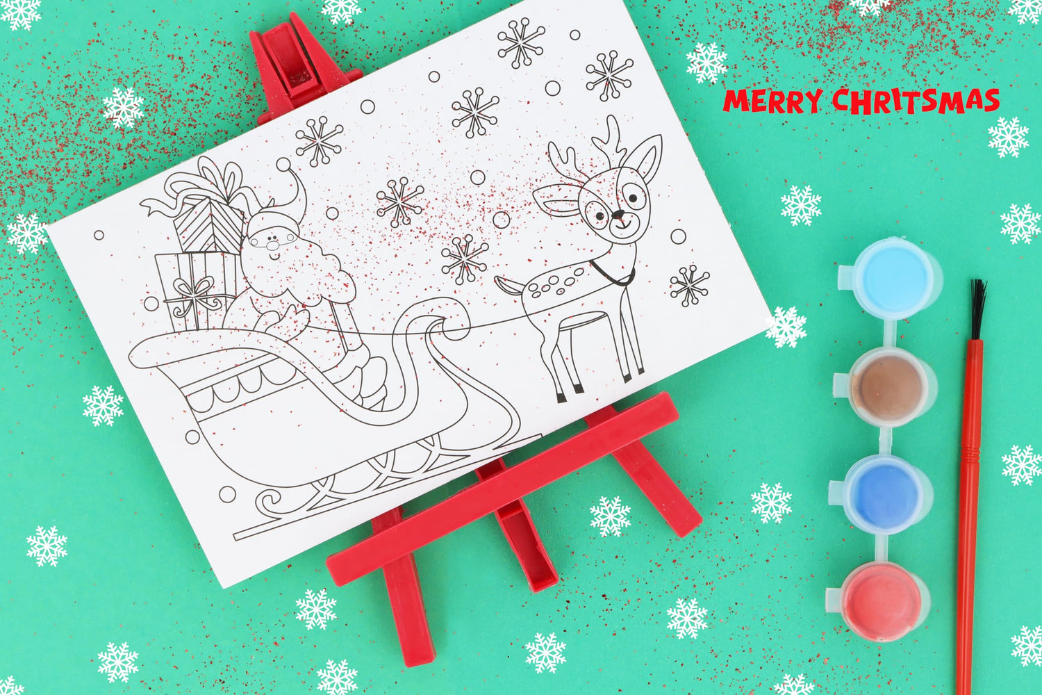 There are two designs of pre-drawn colouring cards available, to be filled with paint, colour, and festive joy! One design includes a gleeful Santa Claus stood beside a pile of presents, and the second design displays Santa Claus in his sleigh in the snow as he and his reindeer pal prepare to depart on the busiest night of their year. One colouring card design will be sent at random.
