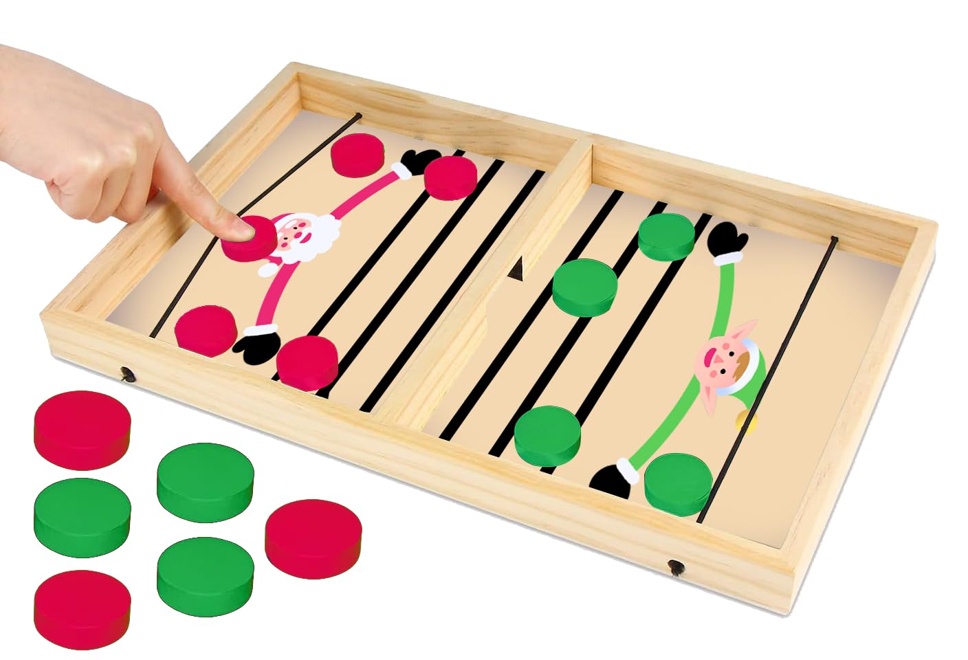 π Father Christmas vs Elf Wooden Disc Game β Fast-Paced Festive Family Fun! π Get ready for a fast and furious festive face-off with the Father Christmas vs Elf Wooden Disc Game! This classic wooden sling puck game brings laughter, excitement, and a touch of Christmas magic to your home. Using the elastic bands, players race to ping their coloured discs through the centre hole β the first to clear their side wins! Beautifully made from quality wood, this traditional-style tabletop game is perfect for Christmas parties, family gatherings, and festive game nights. Easy to learn and endlessly fun for both kids and adults, itβs a brilliant way to spark friendly competition and spread Christmas cheer. A great Christmas gift, stocking filler, or party game, the Father Christmas vs Elf Disc Game will keep everyone entertained all season long!