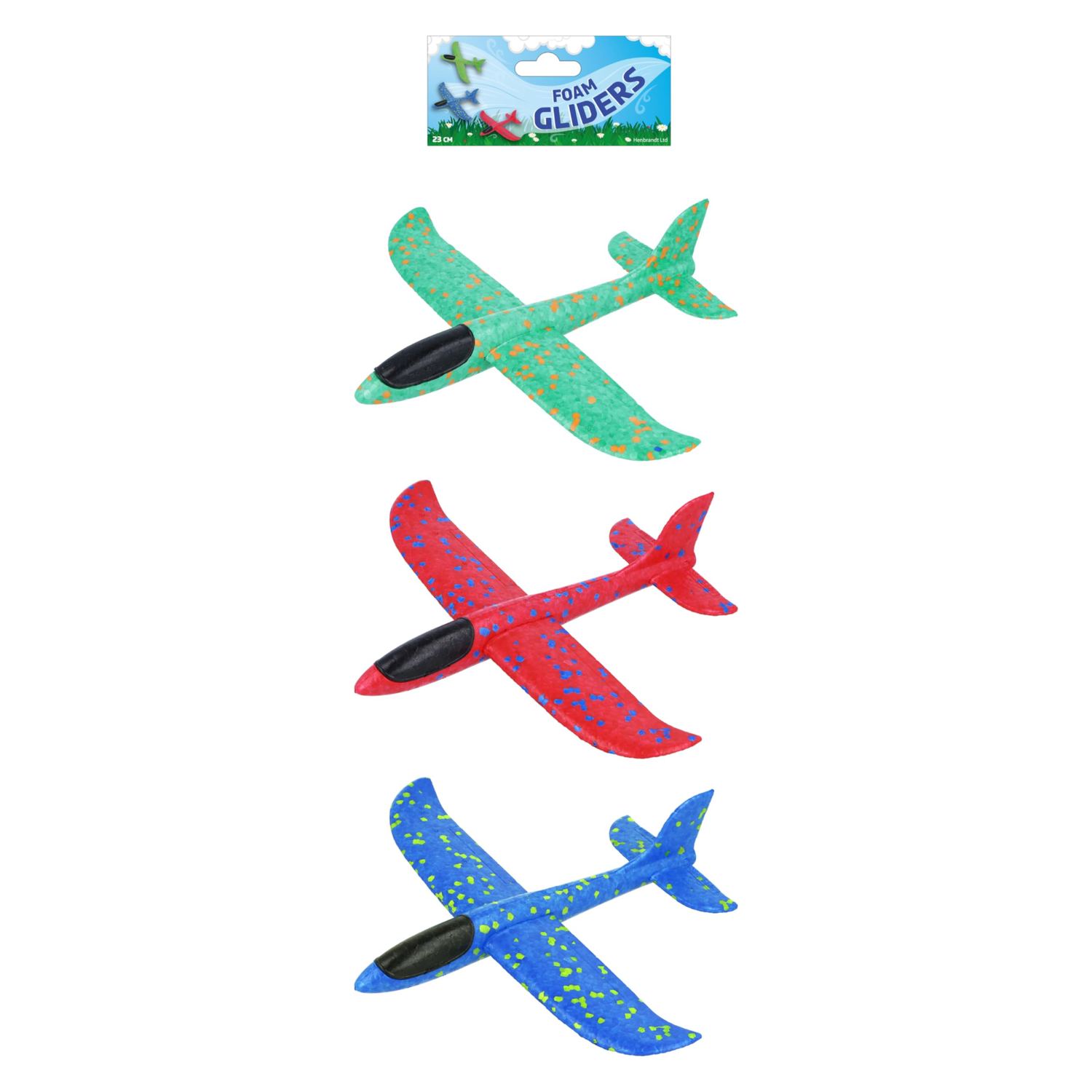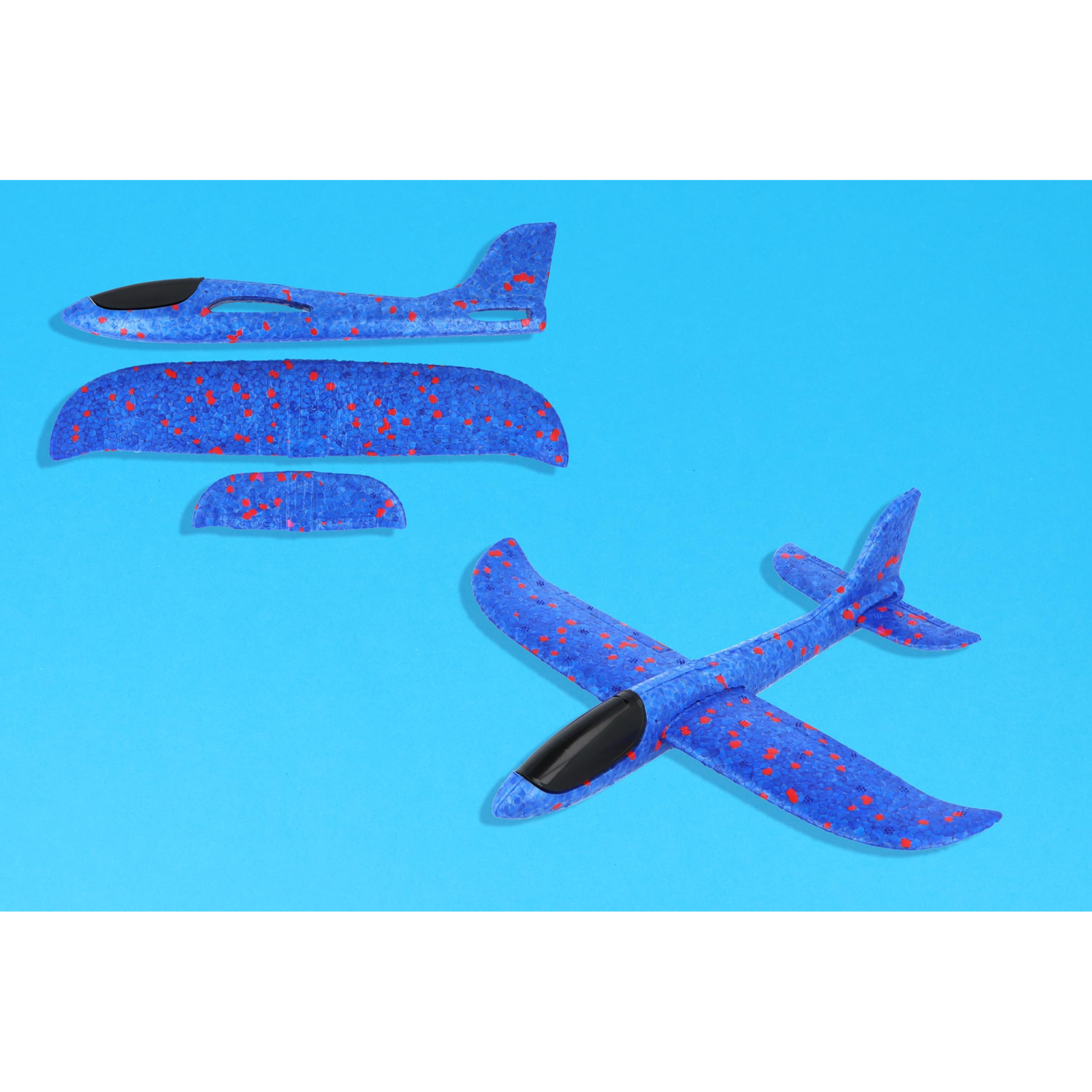 When assembled, the foam airplane gliders measure approx. 23cm / 9inch in length. The aeroplanes come in Blue, Green, and Red, and they have a contrast colour speckling for an enhanced aesthetic appeal.